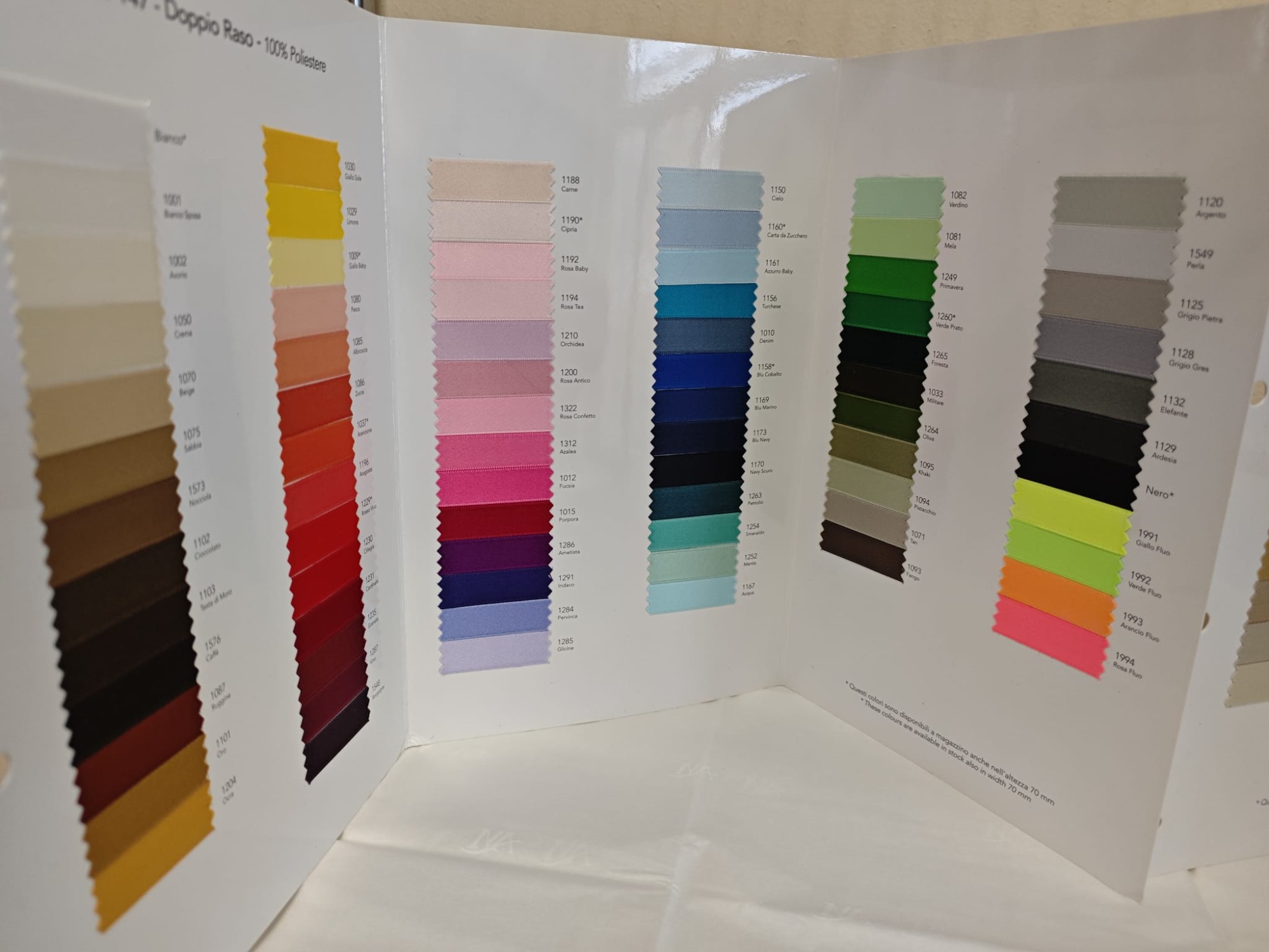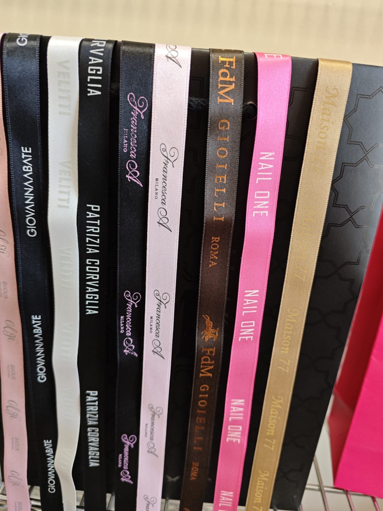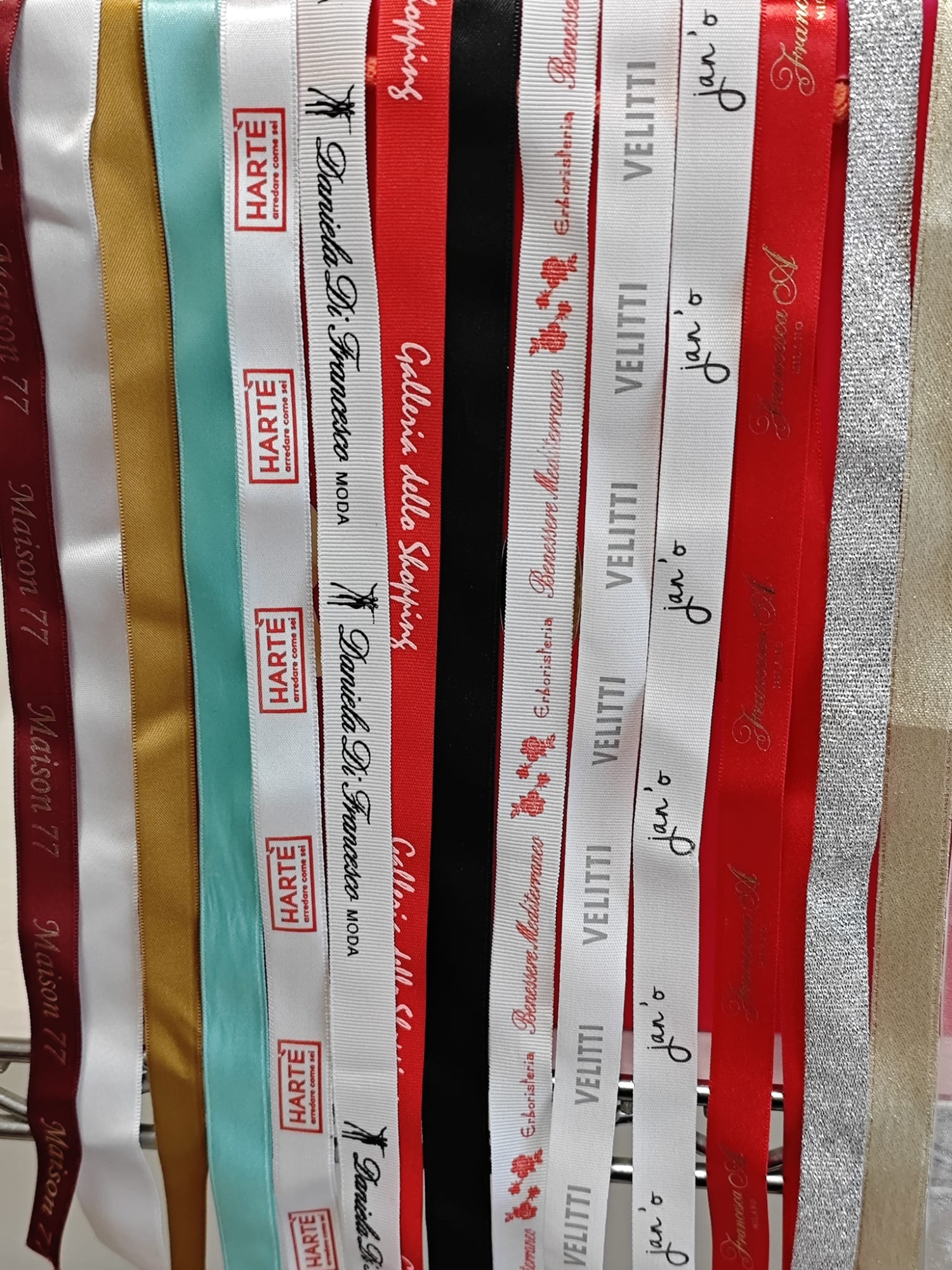 Le fettucce personalizzate vengono prodotte in doppio raso poliestere, in gros grain e cotone spinato o liscio. Le altezze da mm 10 a mm 50. Vasta gamma di colori in confezioni da metri 100.